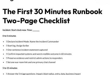 Boards do not need technical detail in the first 30 minutes. They need confidence that control exists. This runbook makes leadership behavior inspectable and supports later review with a timeline and decision log.